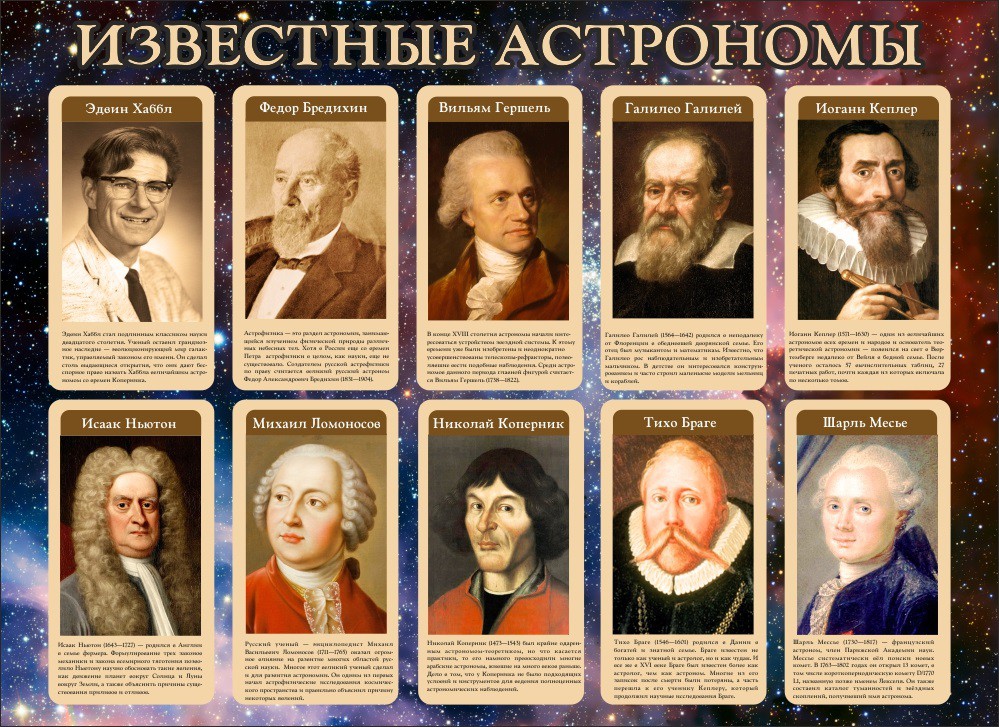 Михаил Ломоносов и Исаак Ньютон, Галилео Галилей и Фёдор Бредихин, Иоганн Кеплер и Никола Коперник - фотография каждого ученого дополнена выборкой из биографии, даты жизни + ключевые достижения.