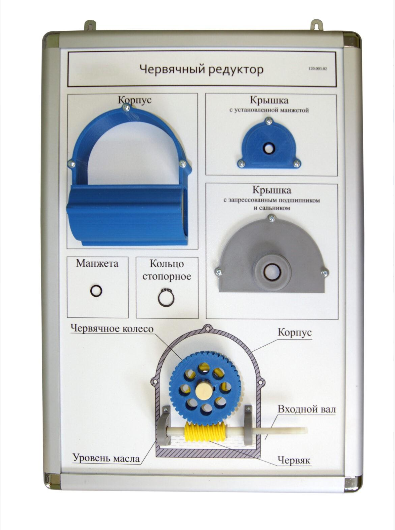 Демонстрационная модель «Червячный редуктор» представляет собой наглядное пособие, планшет формата А2 (594*420 мм), который размещается как в настольном, так и в настенном варианте.