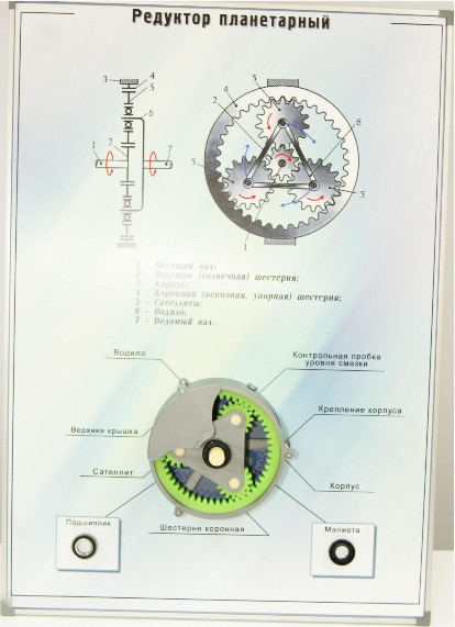 Планшет формата А1 с возможностью использования в настенном и настольном вариантах с закрепленным на нем планетарным редуктором - разрез. Возможно изучение устройства редуктора, позволяет делать измерения геометрических параметров зацепления, определять передаточное отношение методами вращения вала и через числа зубьев колес. Планшет выполнен на основе шлифованной фанеры с наклеенным изображением кинематической схемы планетарного редуктора с обозначением элементов. В нижней части планшета закреплена разрезная модель планетарного редуктора. Обрамление планшета выполнено с помощью алюминиевого профиля.