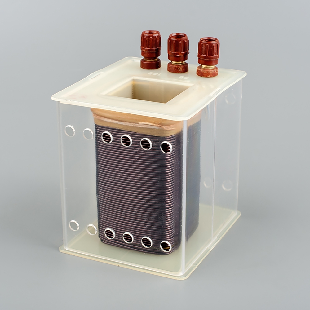 Обмотки закрыты прозрачными обечайками, с нанесенной мнемосхемой. Катушка может работать с магнитопроводом изделия "Трансформатор универсальный ТРУ (учебный)".