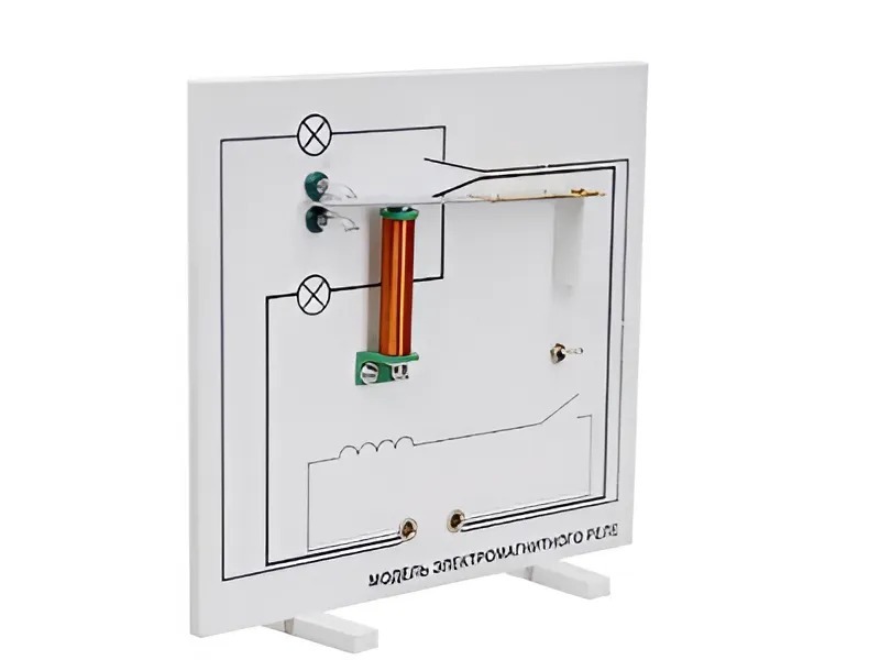 Реле смонтировано на изолирующей панели таким образом, что хорошо видны все его детали. Реле состоит из электромагнита, стальной подпружиненной пластины и выключателя. На панели установлены клеммы для подключения источника питания и лампы для демонстрации работы реле. Также на панели указаны схемы электрических цепей, по которым течет ток при демонстрации работы реле. Панель укреплена на поворотных ножках для демонстрации прибора в вертикальном положении.