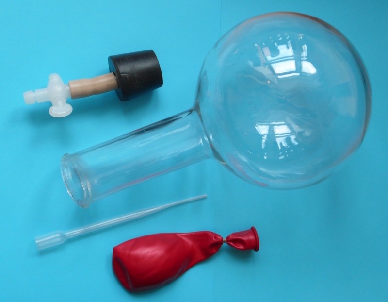 Изделие включает круглодонную стеклянную колбу, шарик воздушный и пластиковую трубку с оттянутым концом. Стенки колбы утолщены и изготовлены из термостойкого стекла. Горловина колбы укупорена резиновой пробкой с осевым отверстием, в котором запрессована трубка с насаженным на нее краном.