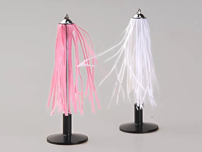 Каждый султан представляет собой большое количество шелковых нитей, закрепленных одним концом между металлическими дисками. Диски закреплены на стержне с подставкой.