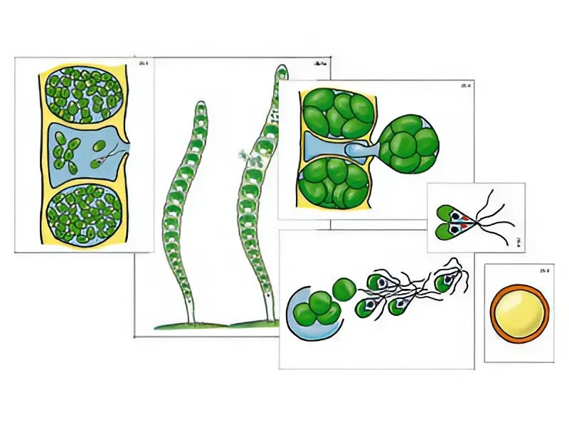Пособие включает 11 карточек, иллюстрирующих этапы бесполого и полового размножения многоклеточной водоросли (на примере улотрикса). Карточки ламинированы матовой (антибликовой) пленкой и снабжены магнитными креплениями, что позволяет монтировать схемы на магнитной доске или экране для динамических пособий.