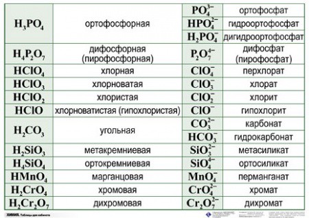 Рациональное оформление интерьера кабинета химии предполагает использование постоянной и сменной экспозиции справочных материалов. До настоящего времени в кабинете химии, как правило, использовали 3 таблицы: “Периодическую систему химических элементов”, таблицу “Растворимости веществ в воде” и “Электрохимический ряд напряжений металлов”. Авторы данного комплекта таблиц для кабинета химии разработали более полный набор в соответствии с обязательным стандартом общего образования РФ. Появились такие таблицы как «Ряд электроотрицательности», «Индикаторы и pH среды», «Названия кислот и кислотных остатков», а также «Физико-химические постоянные», «Основные физико-химические величины», «Множители и приставки кратных и дольных единиц» и другие необходимые на уроках химии таблицы. По-новому представлены таблицы по технике безопасности при работе в кабинете химии: правила изложены в стихах.