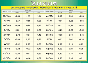 Главная Каталог Демонстрационные учебно-наглядные пособия Кабинет химии Таблица "Электродные потенциалы металлов в различных средах" (100х140 сантиметров, винил)