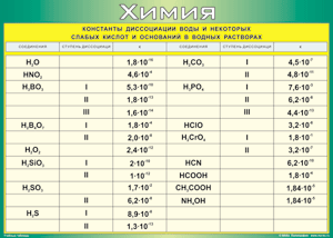 Главная Каталог Демонстрационные учебно-наглядные пособия Кабинет химии Таблица "Константы диссоциации воды и некоторых cлабых кислот и оснований в водных растворах" (100х140 сантиметров, винил)