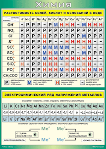 Таблица "Растворимость солей, кислот и оснований в воде. Электрохимический ряд напряжений металлов" (100х140 сантиметров винил)