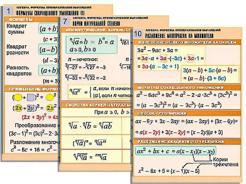 Комплект учебно-наглядных пособий "Алгебра. Формулы. Преобразования выражений" формата А1 с полноцветной двухсторонней печатью и матовой двухсторонней ламинацией в количестве 10 таблиц.