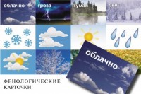 Таблица с подвижными стрелками для иллюстрирования темы «Время», «Единицы времени» (час, минута, секунда), одновременно на этой же таблице представлен «Календарь природы», для коллективного наблюдения за изменениями неживой природы. На таблице представлены макет термометра и место для крепления фенологических карточек, отражающих различные погодные явления. Также задача пособия в систематизации знаний учащихся о сезонных явлениях природы и сроках их наступления, на таблице присутствуют наименования времен года, месяцев и дней недели.