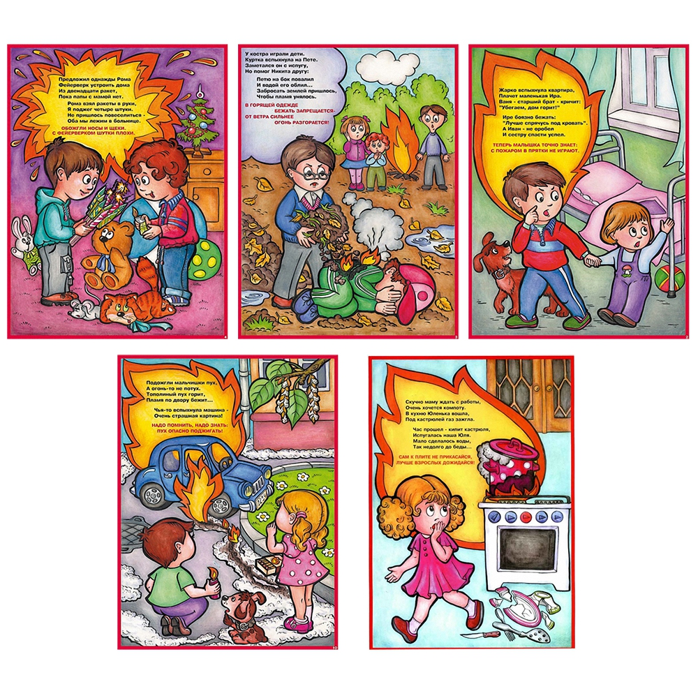 Альбом состоит из 10 отдельных листов, наглядно иллюстрирующих опасности беспечного обращения с огнем и огнеопасными материалами, описывающих правильные модели поведения в случае возникновения пожара.