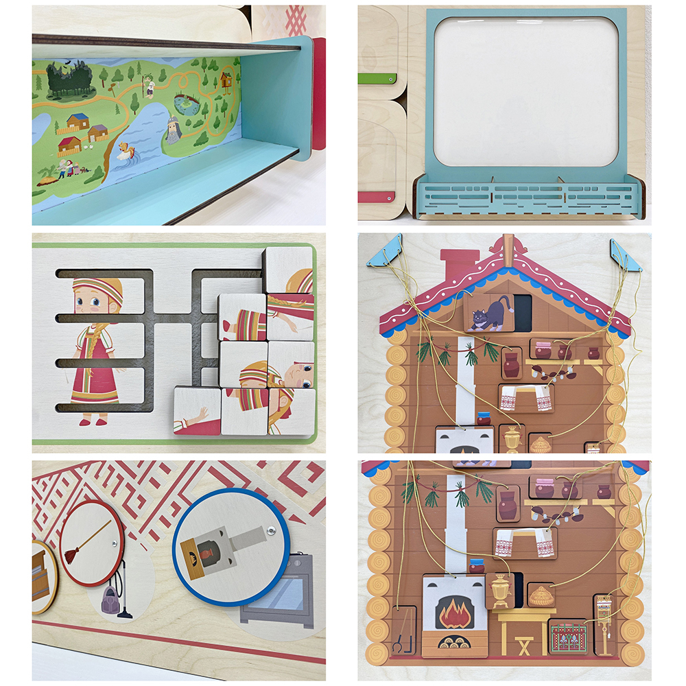 Дидактическая панель «Русский народный быт» знакомит детей с элементами русской народной культуры, развивает логику и мышление, тренирует мелкую моторику и цветовосприятие.