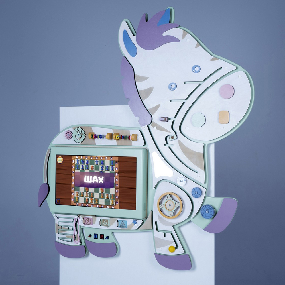 Интерактивный бизиборд «Зебруша» для детских образовательных учреждений, сочетает в себе классические сенсорные элементы Марии Монтессори и современные интерактивные технологии.