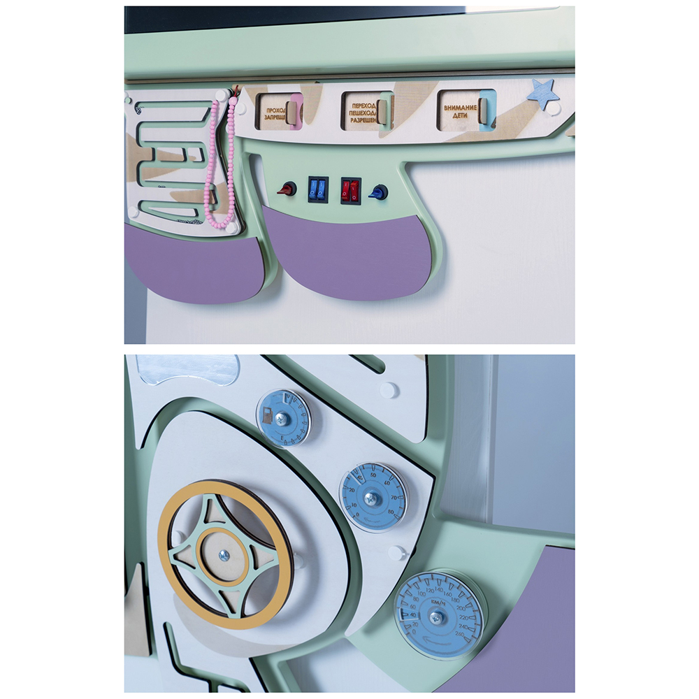 Сенсорные элементы разработаны с акцентом на правила дорожного движения. Оригинальные логические головоломки, кнопки, переключатели, счёты, шестерёнки и даже автомобильные скоростные приборы.