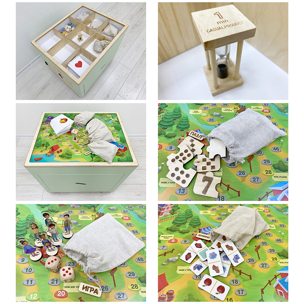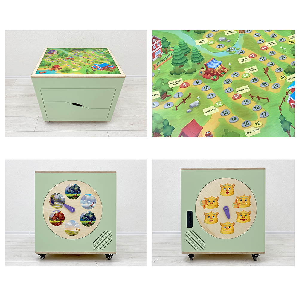 Мобильный куб на колёсиках может передвигаться в любое место класса, где детям удобнее заниматься, по бокам он оформлен бизибордами «Колесо настроения» и «Времена года», а сверху на крышке – красочная пошаговая игра-бродилка с вопросами на английском. Внутри в удобных ящиках спрятались: дидактические карточки, игра «Дубль», сортеры, пазлы, лото, домино, книга First Book.