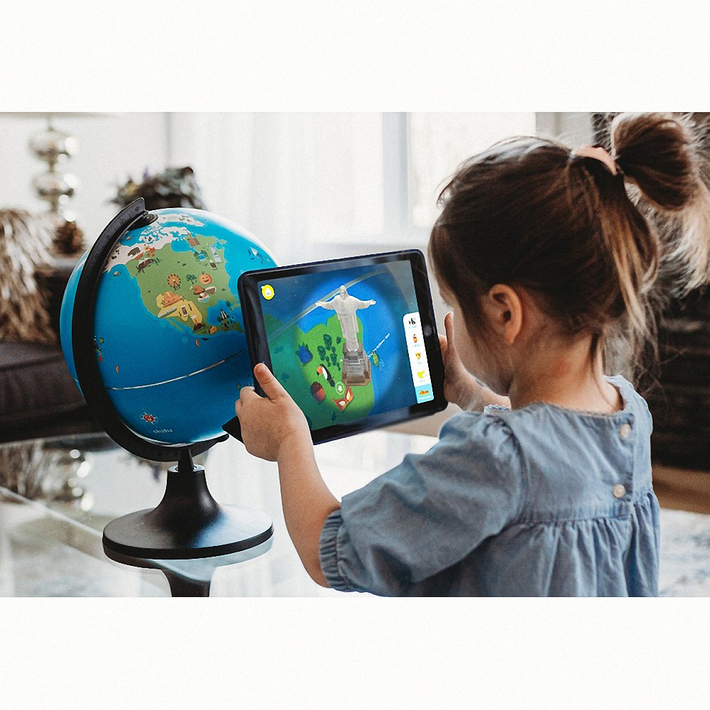 Это современная и умная версия глобуса, дополненная 3D объектами, которые ребенок сможет увидеть, направив на него камеру умного устройства.
