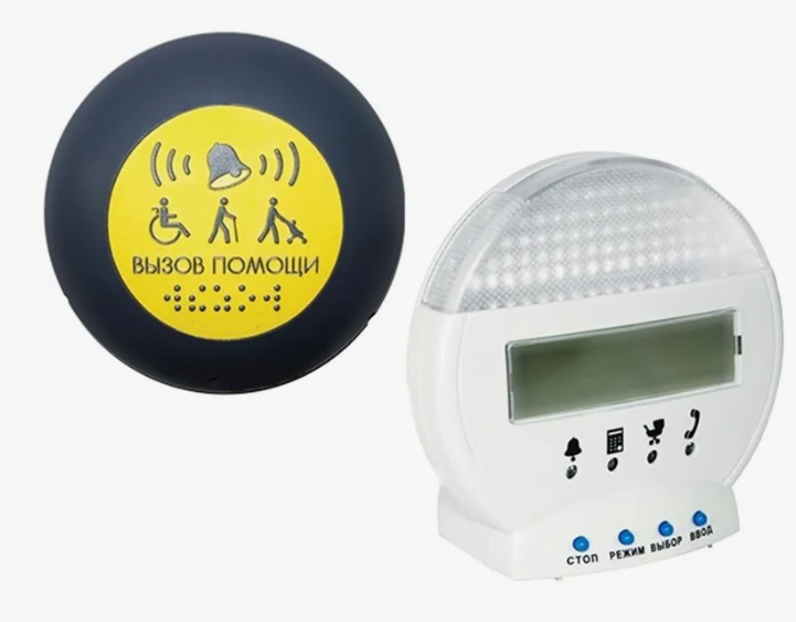 При совместной установке кнопок информирования, вызова помощи и звукового маяка после нажатия человеком с ограниченными возможностями на кнопку «вызов помощи», сигнал передается сотруднику учреждения, а после нажатия сотрудником на кнопку «сброс» на приемнике, передается обратный сигнал на расположенный около кнопки вызова помощи звуковой маяк сигнал, активирующий на звуковом маяке голосовое сообщение «к вам вышел помощник, ожидайте». Одновременно рядом с кнопкой вызова помощи располагается дополнительная кнопка активации звукового голосового сообщения, записанного на звуковом маяке, информирующая людей с инвалидностью о доступности здания, вариантах получения ситуационной помощи, о другой значимой информации.