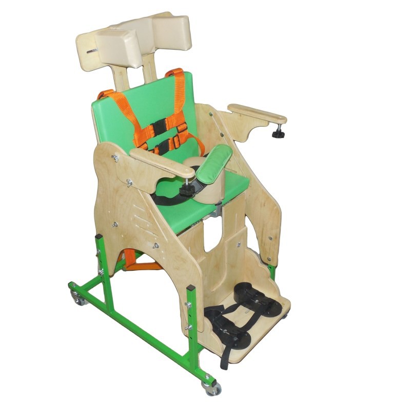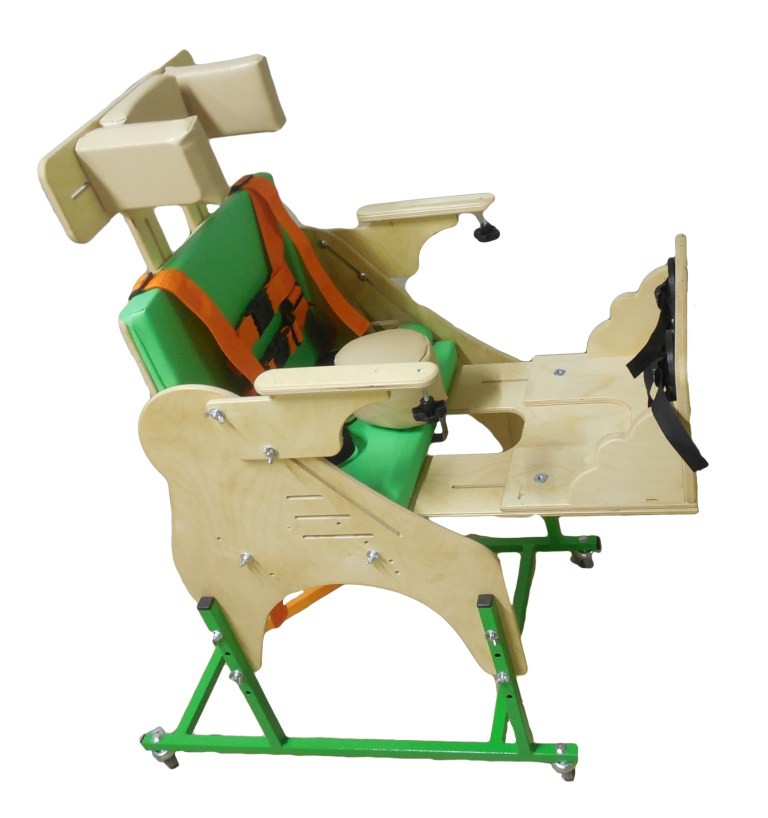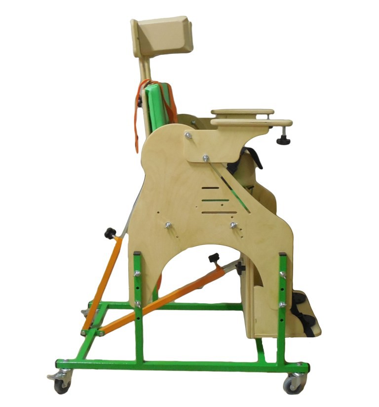 Опора для сидения представляет собой ортопедическое кресло на деревянной раме, расположенной на металлическом четырехколесном основании. Все колеса поворотные, задние колеса оснащены стояночными тормозами. Сидение и спинка оснащены съемными мягкими подушками. На подножке расположены пластиковые крепления для ступней типа «сандалии» с задними упорами и крепежными ремешками. Опора оснащена подголовником и съемным столиком, устанавливаемым на подлокотники.