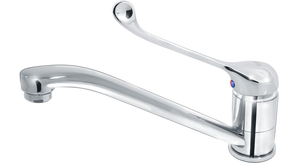 Смеситель представляет собой изделие из латуни с хромированным покрытием, что обеспечивает высокие эксплуатационные характеристики изделия. Однорычажный смеситель оснащён удлинённой рукояткой с утолщением на конце, что позволяет пользоваться устройство без использования кистей рук, что значительно упрощает активацию крана людьми маломобильных групп населения. Смеситель также оборудован удлинённым статичным изливом, что также обеспечивает беспрепятственное использование устройства людьми в инвалидных креслах.