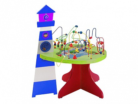 Детский игровой сенсомоторный комплекс -представляет собой декоративный стол, на котором размещены разные по сложности и форме проволочные лабиринты с яркими разноцветными деревянными бусинками различных размеров. В состав комплекса входит декоративная стойка, на которой установлены элементы для привлечения внимания детей и тренировки их координации.