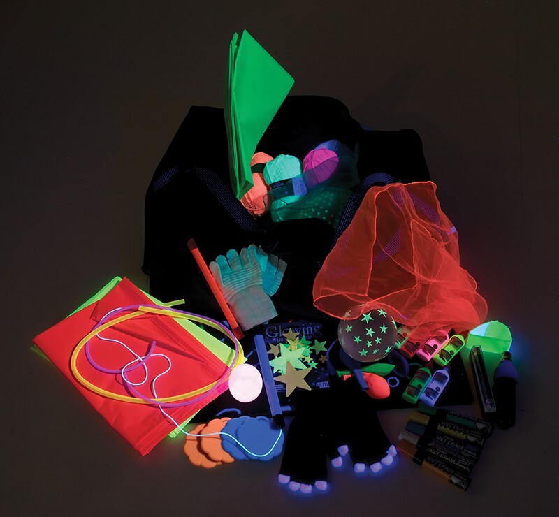 Набор для визуального восприятия для детей с особенностями развития. В комплект входят игрушки для визуальной стимуляции с различными световыми эффектами, а также игрушки, светящиеся в темноте.