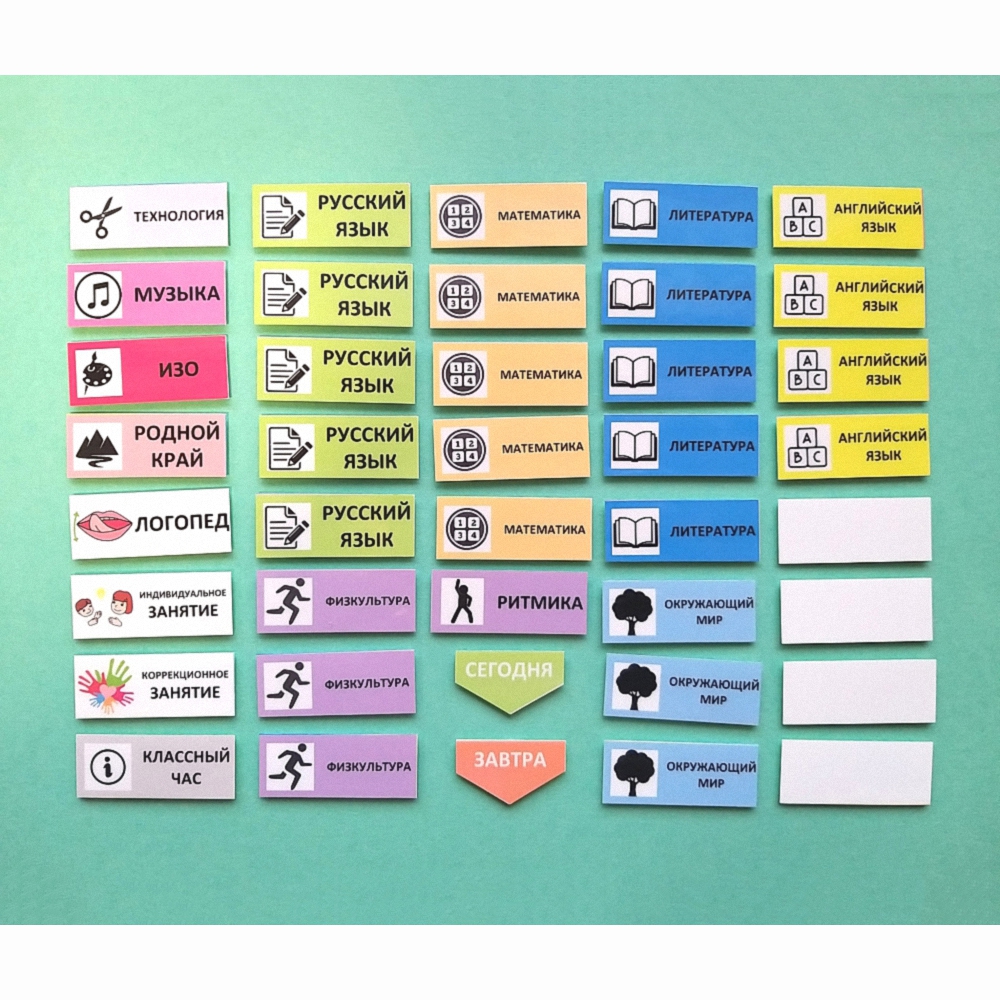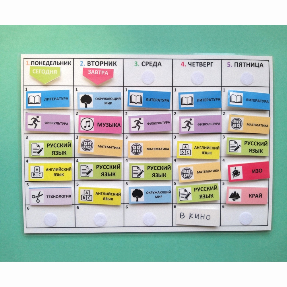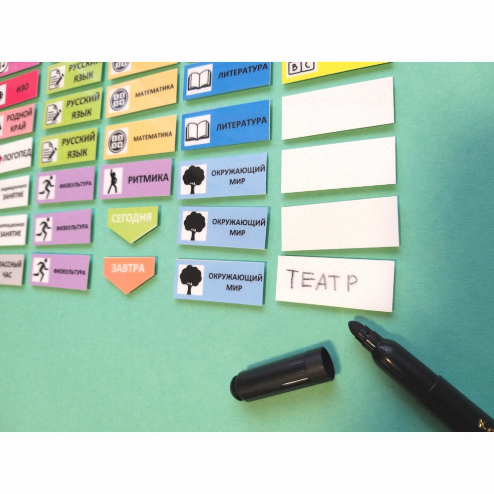 Все это поможет ребенку быстрее овладеть полезной привычкой - пользоваться расписанием. Со временем можно убирать эти подсказки (если стоит такая задача): закрывать пиктограммы, переходить на использование карточек с надписями от руки, убрать цветовую маркировку.