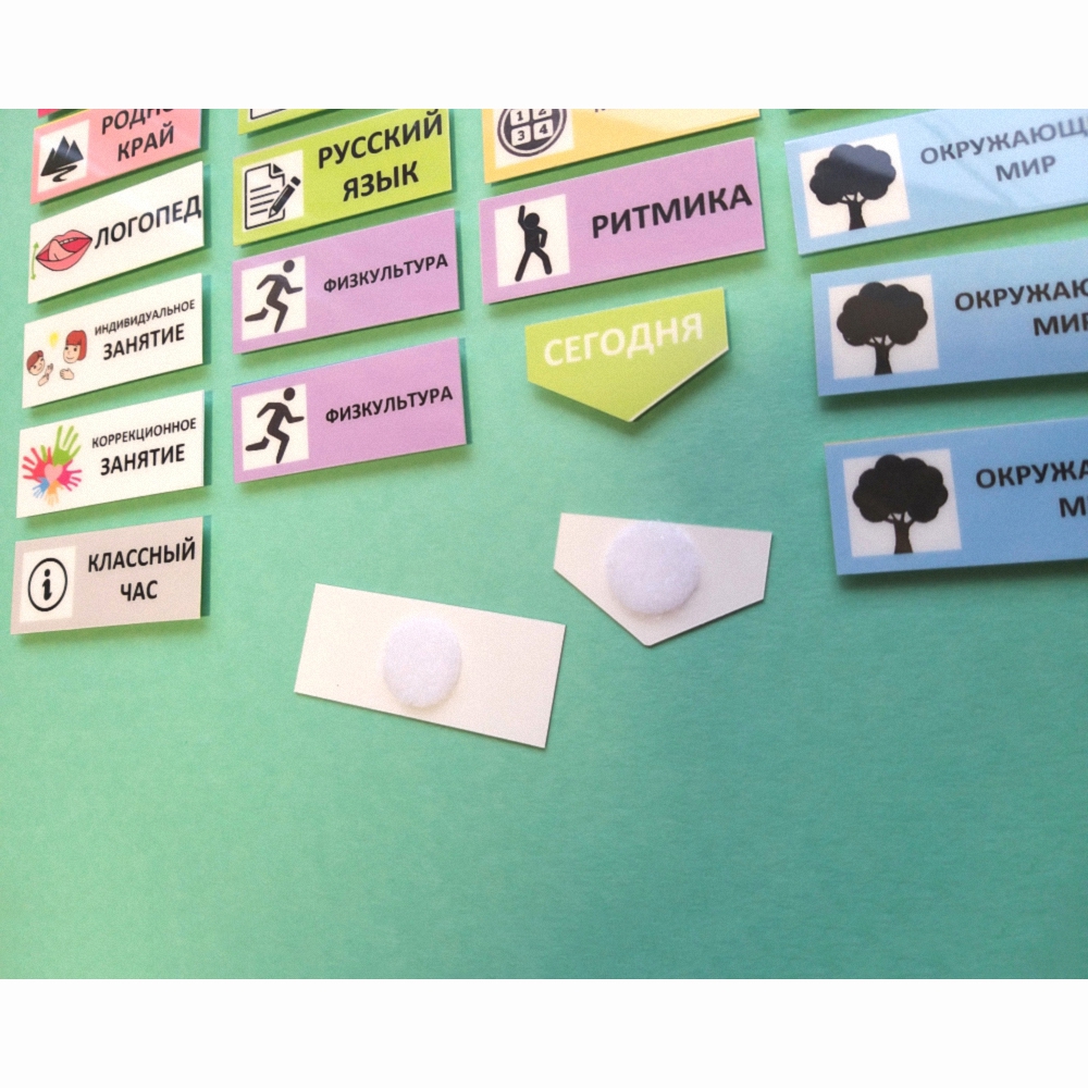 Расписание со съемными карточками-уроками всегда будет показывать актуальную информацию, потому что внести необходимые изменение не представляет труда - просто перенести карточку. На расписании расположены жесткие липучки, на карточках мягкие. Все карточки выполнены из прочного водостойкого пластика, они прослужат очень долго. На них можно наклеивать необходимые изменения, на пустых карточках можно писать маркером.