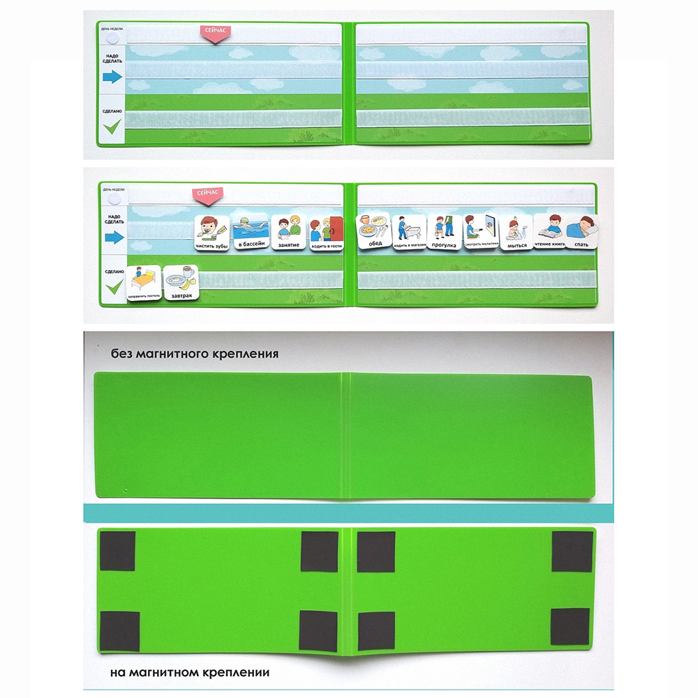 Визуальное расписание на плотной пластиковой основе можно заказать с магнитными креплениями, чтобы закрепить на холодильник.