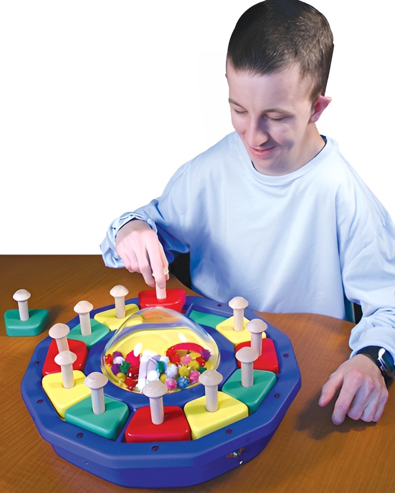 Данный центр разработан специально для развития зрительного, слухового и тактильного восприятия. Центр состоит из 12 разборных форм, которые легко вынимаются из основания. Задача – в правильном порядке (по цветам) расставить формы в соответствующие ячейки.