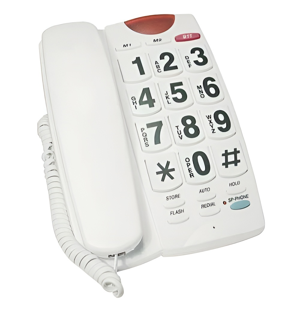 Телефонный аппарат, усиливающий громкость, с крупными кнопками.