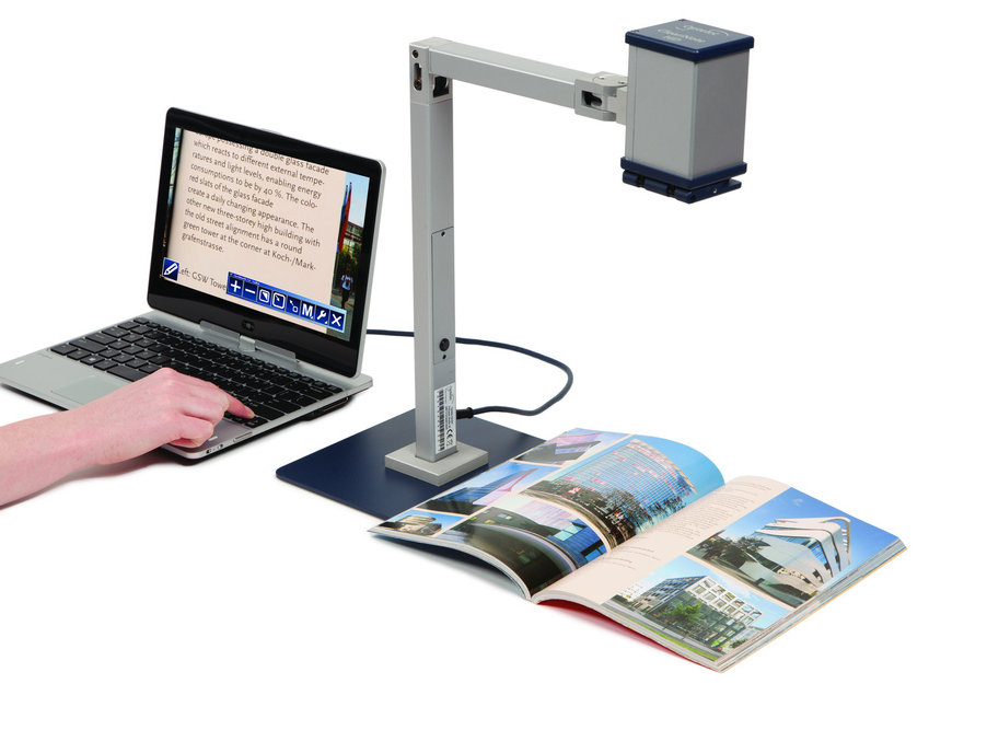 Видеоувеличитель представляет собой легковесную и тонкую конструкцию. Гибкое крепление камеры и подвижный штатив дают возможность рассматривать объекты, с какой бы стороны они не находились. С помощью ClearNote легко читать книги, просматривать фотографии, лежащие на столе, читать текст со школьной доски, а в случае необходимости можно направить камеру на себя, чтобы, например, сделать макияж. Прорезиненное основание подставки надежно удерживает устройство на поверхности стола. В случае необходимости видеоувеличитель легко разбирается, упаковывается в сумку, входящую в комплект, переносится и собирается на новом месте. Компактный пульт управления имеет достаточную длину кабеля для комфортного использования на рабочем месте. Подключить видеоувеличитель и установить программное обеспечение можно на компьютер даже с минимальными параметрами, управляемый операционной системой семейства Windows.