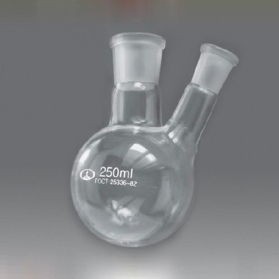 Колба круглодонная с двумя горловинами и шлифами 250 мл предназначена для проведении синтетических реакций (фильтрования, выпаривания, перегонки, дистилляции, синтеза), требующих одновременного подключения к работе нескольких приборов.