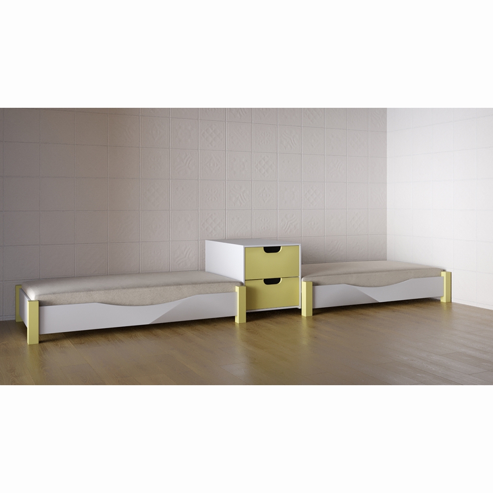 Кровать детская двухместная предназначена для детей от 3 до 10 лет. имеет 2 спальных места, между которыми есть небольшая тумбочка с 2-мя ящичками. Выполнена в нейтральной цветовой гамме, что позволяет использовать ее в помещении с любым интерьером. Конструкция кровати надежна и прочна – это гарантирует безопасную эксплуатацию. Кровать представленной модели выполняет роль спального места в группах детских садов, яслях. При помощи комплекта таких кроваток можно стильно и современно оформить спальную комнату для детей.