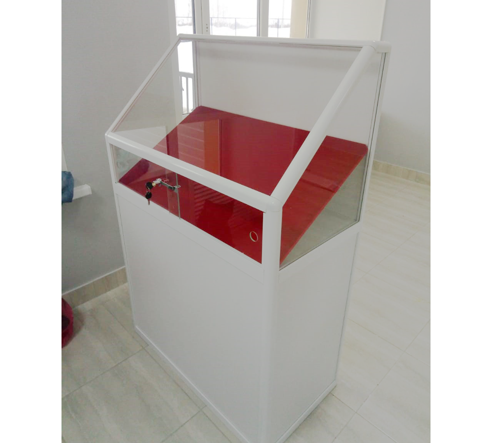 Витрина выполнена из алюминиевого профиля, полка из МДФ -8 мм, драпировка тканью, дверцы и боковые стенки из минерального стекла - 4 мм, с бронированием пленкой 112 мкм.