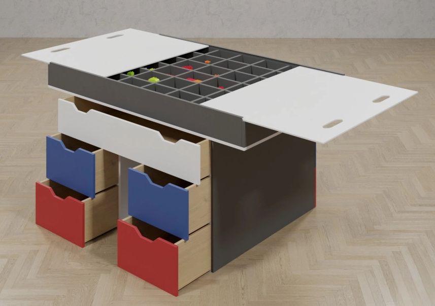 Занятия по робототехнике и конструированию роботов - интересный и сложный процесс. Такие уроки помогут развивать много важных и полезных качеств, которые обязательно пригодятся малышам в дальнейшей жизни. Для того, чтобы процесс конструирования и роботостроение приносил максимальное удовольствие необходимы не только детали для сборки, но и качественная мебель. Такой стол для робототехники - отличный вариант для тех, кто ценит удобство и комфорт. Данный стол содержит столешницу с большой площадью, что позволит ребятам конструировать с максимальным комфортом. Также столешница может раздвигаться с обе стороны, открывая дополнительное пространство со специальными ячейками, в которых дети смогут хранить проекты, находящиеся в процессе сборки. Целых десять вместительных выдвижных ящика могут вместить как личные вещи детей, так и материалы, которые нужно всегда иметь под рукой. Этот стол изготовлен из качественных и крепких материалов, и прослужит детям во время занятий по конструированию роботов в течении долгого времени.