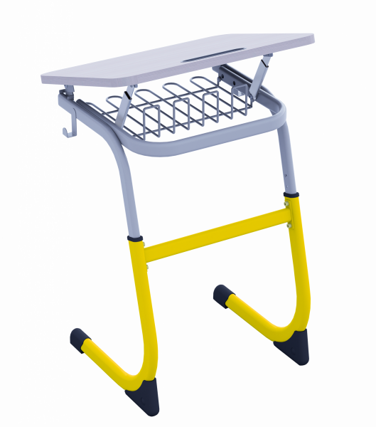 Парта одноместная регулируемая по высоте имеет столешницу ЛДСП с углом наклона, в столешницу встроен пластиковый пенал, наличие сетки и крючка для рюкзака.