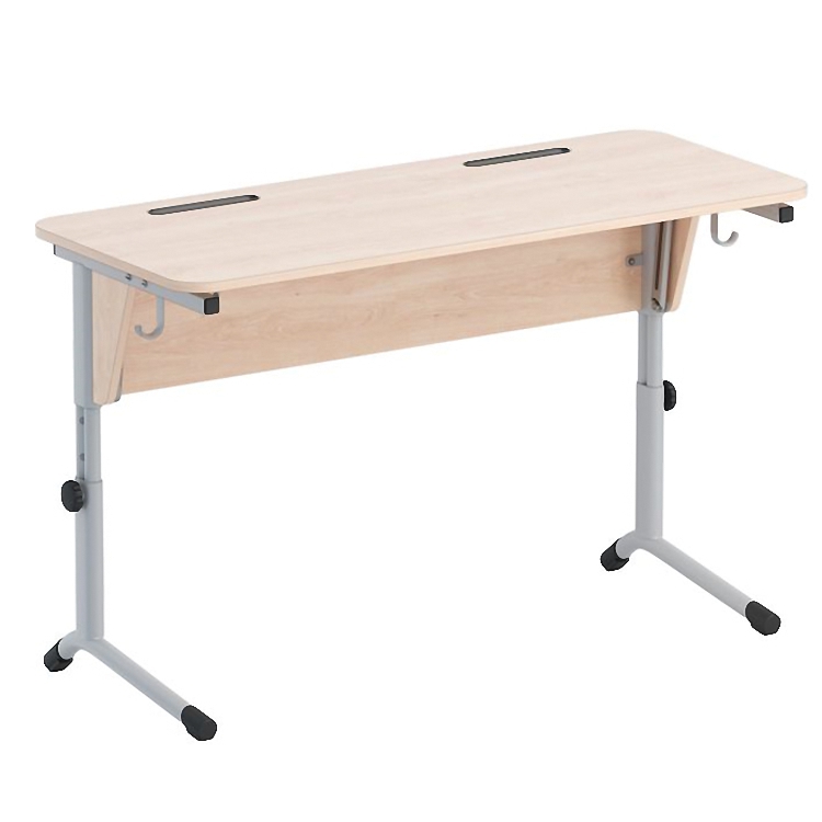 Крепление металлической основы со столешницей осуществляется методом скрытого крепления, без выступающих на рабочей поверхности болтов. Имеется два крючка для портфелей. Каркас стола имеет полимерные подпятники, предотвращающие повреждение напольных покрытий.