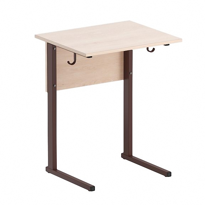 Стол ученический одноместный изготавливается на металлическом каркасе прямоугольного и квадратного сечения, окрашенном порошковой краской, стойкой к химическим и механическим воздействиям, на свободных концах труб установлены заглушки из ударопрочных полимеров. Столешница и передняя панель выполнены из ламинированной ДСП 16 мм, торцы столешницы облицованы кромкой ПВХ 2 мм.