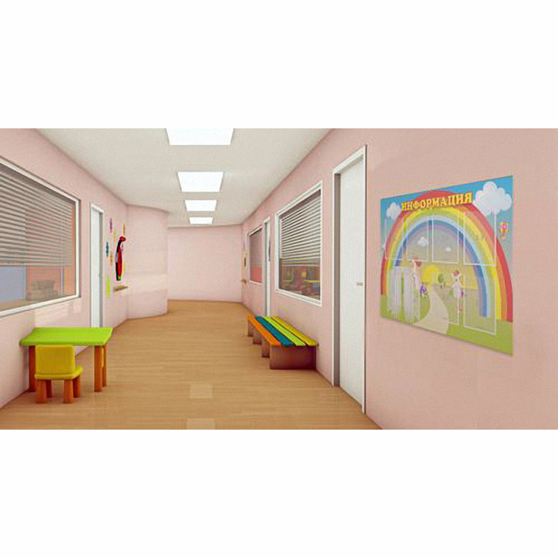 Яркий дизайн этого стенда не останется незамеченным и взрослыми и детьми. Извилистая дорога, уходящая прямо к солнцу, приглашает пройти через ворота, выполненные в виде огромной радуги, в сказочную страну. Главным элементом дизайна является раскрытая книга в левом нижнем углу стенда. Данная перекидная система позволяет поместить достаточно большое количество важной информации.