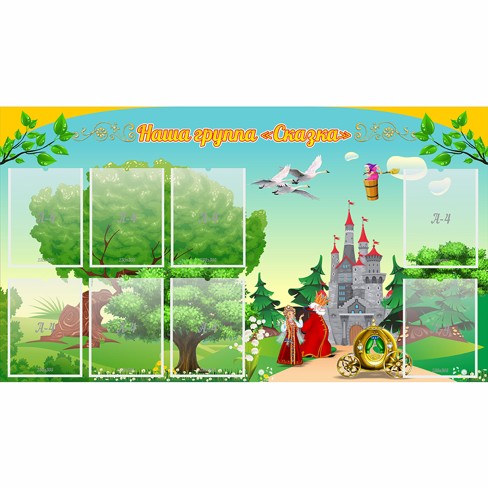 Дизайн этого стенда действительно сказочный! Через густой лес пролегла дорога, в конце которой возвышается огромный замок. А вокруг замка видны разные сказочные герои и предметы. Детям будет интересно угадать, кто из них из какой сказки сюда пожаловал.