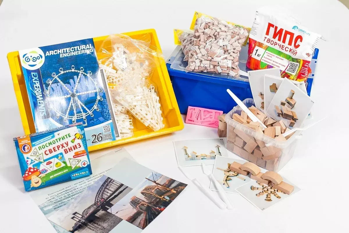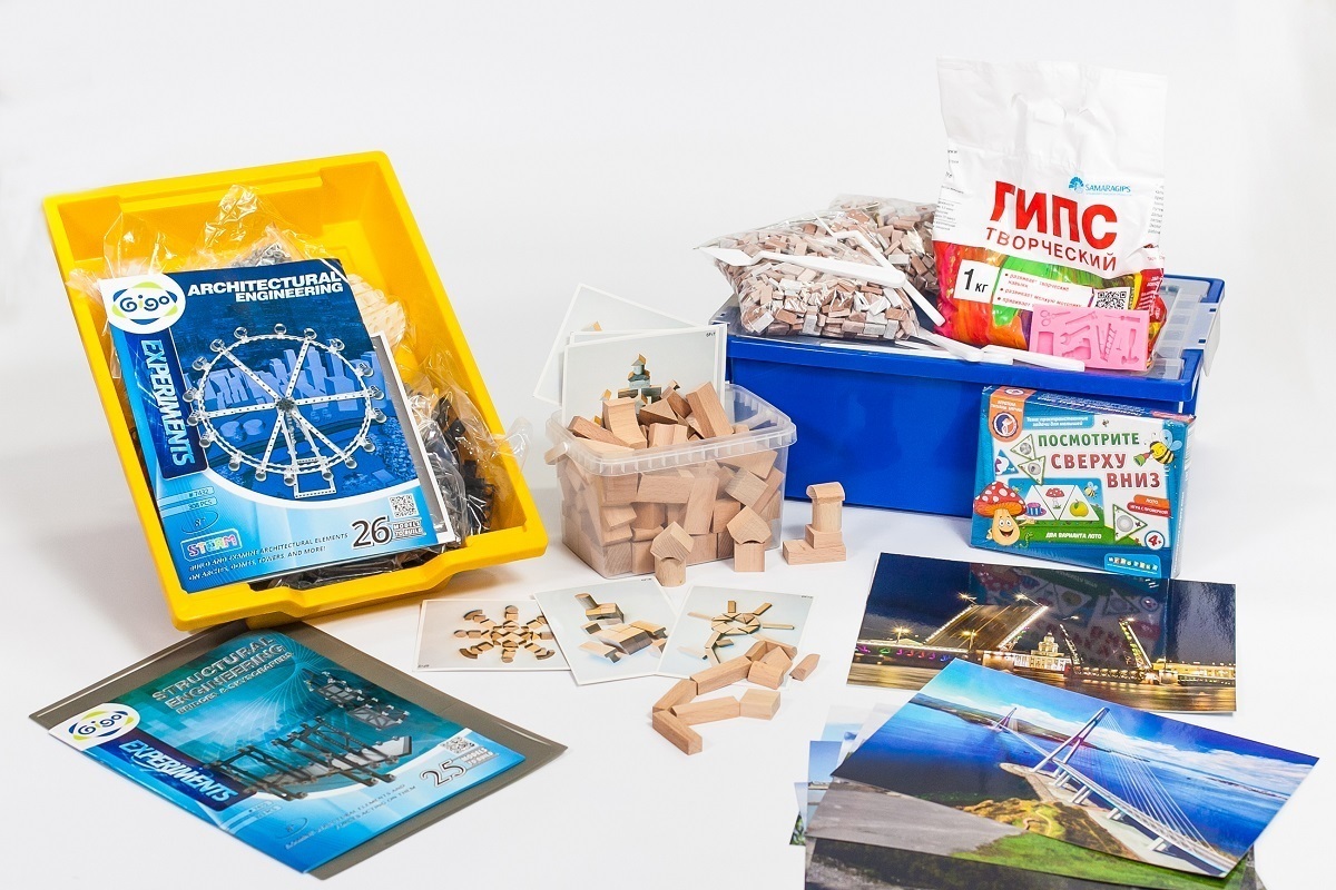• Комплект № 1 «Архитектура». В комплект входят элементы для конструирования из различных материалов: дерево, пластик, бумага, карточки-схемы, набор инструментов «Юный архитектор», видео-контент, журнал проекта.