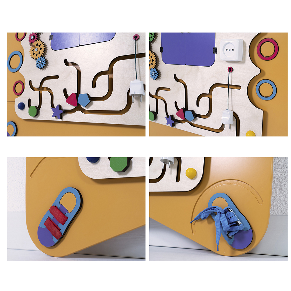 Главная задача бизибордов: помочь детям безопасно освоить предметы быта (защелки, крепления, механизмы, переключатели, розетки). На обесточенных тренажерах с привлекательными рисунками дети развивают мелкую моторику, оттачивают мастерство, чтобы в дальнейшем применить полученный навык на практике.