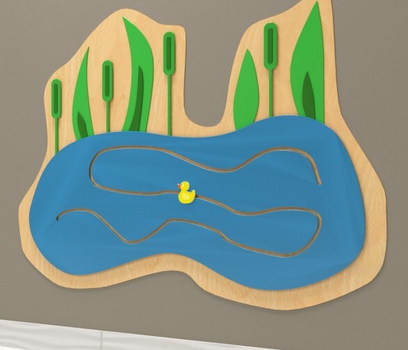 Бизиборд - игровой модуль для детей от 1 года. Он крепится к стене и отличается лаконичным внешним видом. Основание исполнено в нейтральной гамме, на которой размещено озеро с камышами и уточкой. Поверхность бизиборда обработана по специальной технологии, гарантирующей безопасное использование.