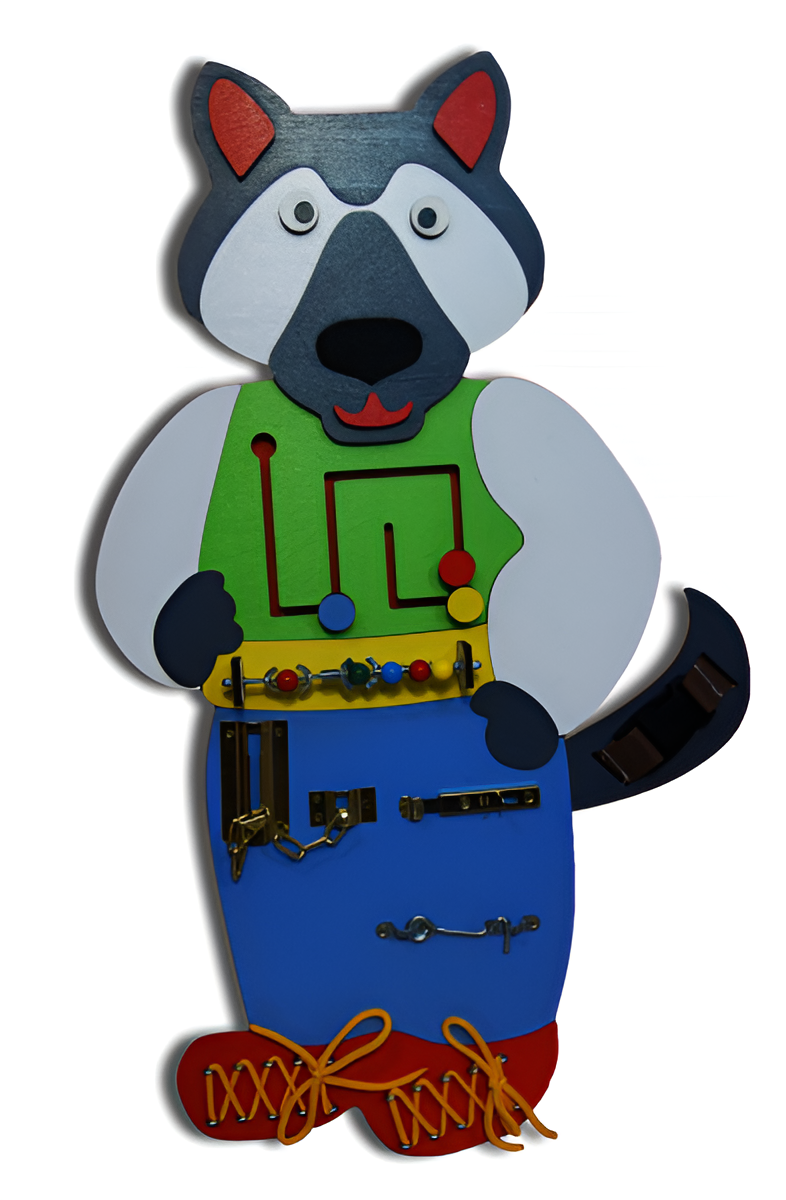 Бизиборд – дидактическое приспособление с игровым уклоном с высокой игровой ценностью для детей от 1 года. Бизиборд в виде волчка-серого бочка - одна из моделей, которая крепится к стене. Основа изготовлена в виде фигуры сказочного Волка, на которой размещены разнообразные приспособления для детской игры. Все края закруглены и обработаны по специальной технологии, что гарантирует безопасность в использовании даже самыми маленькими детками.