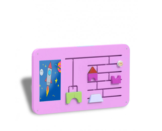 Панель представляет лабиринт с подвижными частями от космического корабля. Все они легко перемещаются из стороны в сторону, вверх и вниз. Справа изображен рисунок ракеты, которые можно собрать по образцу в определенном поле. Дидактическая панель на космическую тематику заинтересуют как маленьких детей, так и постарше, а родителям поможет сохранить дом в целости и сохранности. Она подойдет для домашнего использования и для специальных учреждений.