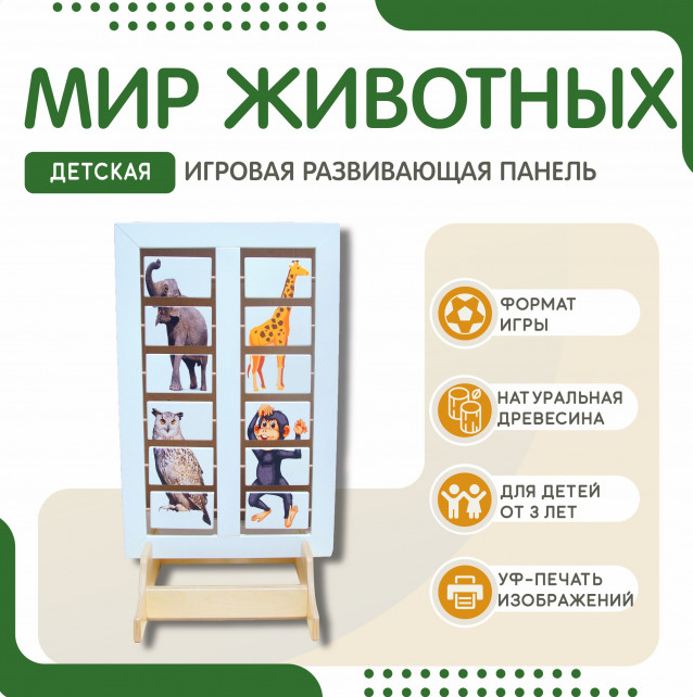 Напольная развивающая панель о мире животных №2 изготовлена из натурального дерева с трехступенчатым шлифованием и безопасным покрытием красками и лаком. Панель состоит из двухсторонних секций, в каждой из которых размещены вращающиеся таблички с изображениями частей животных и птиц. Принцип действия - ребенок, вращая таблички по очереди, составляет изображения животных и птиц методом подбора. Такая игра помогает развивать оба полушария мозга одновременно, задействуется логическое и критическое мышление.