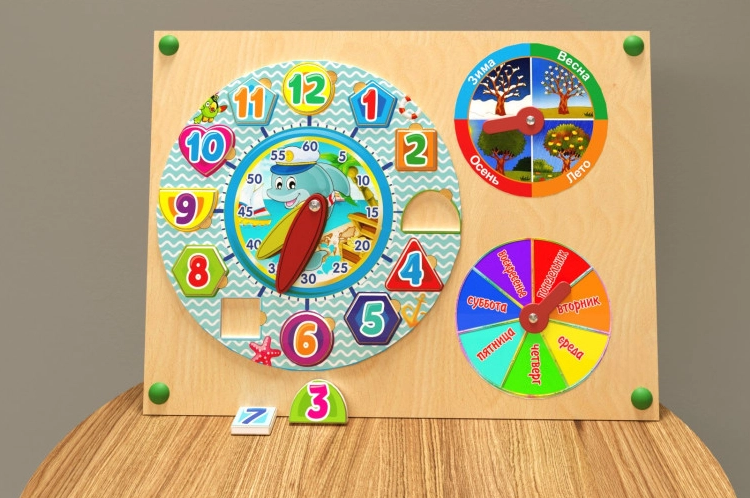 Настенная панель с часами предназначена для обучения детей времяисчислению в масштабе минут, часов, дней недели и пор года. Выполнена в форме компактной панели с яркими цветовыми акцентами, которые выгодно смотрятся на нейтральном фоне. Поверхность настенной панели обработана по специальной технологии, производитель гарантирует безопасность в использовании.