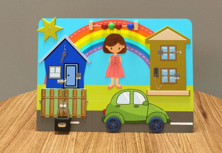 Играя с ключом, замком и дверными запорами, ребёнок приобретает необходимые бытовые навыки. Открывание и закрывание дверок стимулирует развитие мелкой моторики пальцев. Также на примере ярких и красочных картинок можно познакомить ребёнка с понятиями того, какая бывает погода, что такое радуга и откуда она берётся.