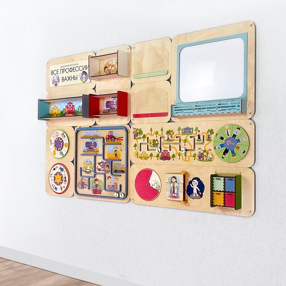 Панель знакомит с разными профессиями и важными этапами жизни человека, развивает логику и мышление, тренирует мелкую моторику и цветовосприятие.