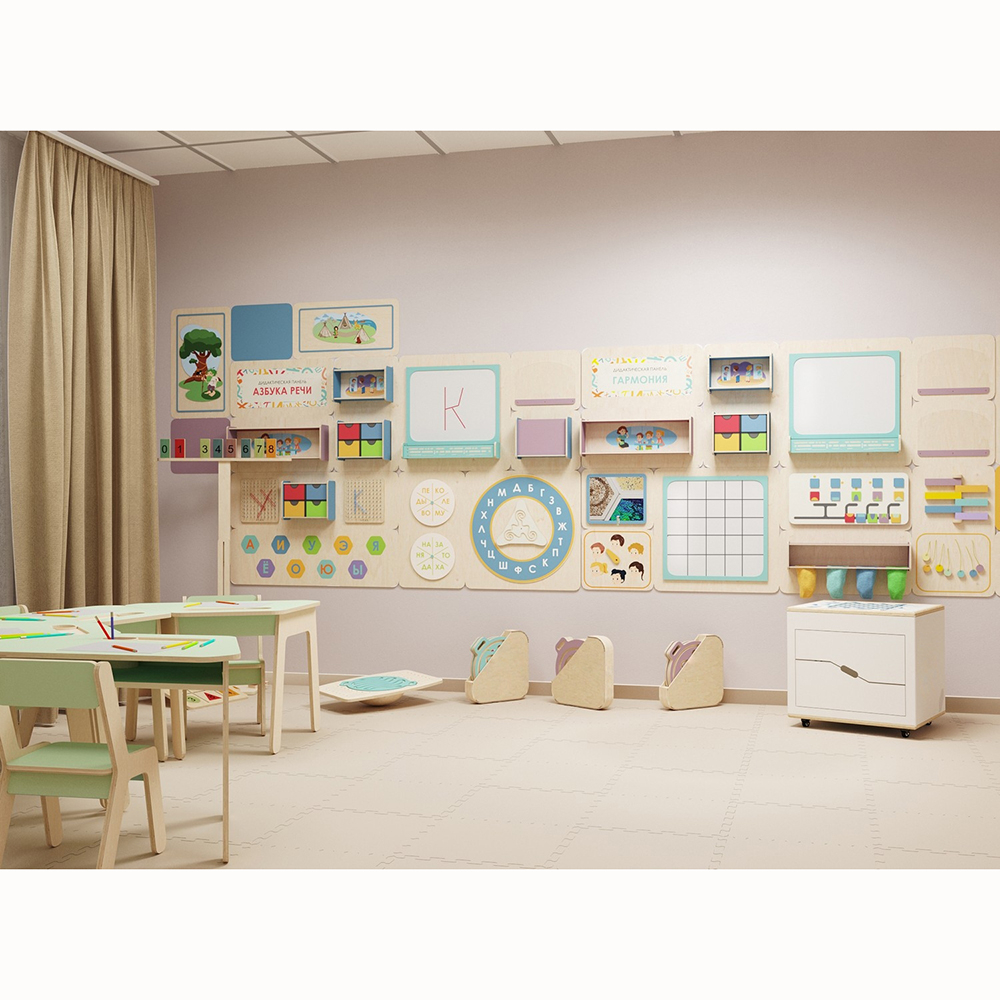 - Зонирование и функциональность. На основе требований Государственного Стандарта наши методисты создали универсальную комплектацию для кабинета психолога и логопеда – это мобильная, многофункциональная предметно-развивающая среда, в которой все дидактические и коррекционные инструменты, входящие в комплект, вариативны в использовании для разных возрастов ребёнка и задач обучения.